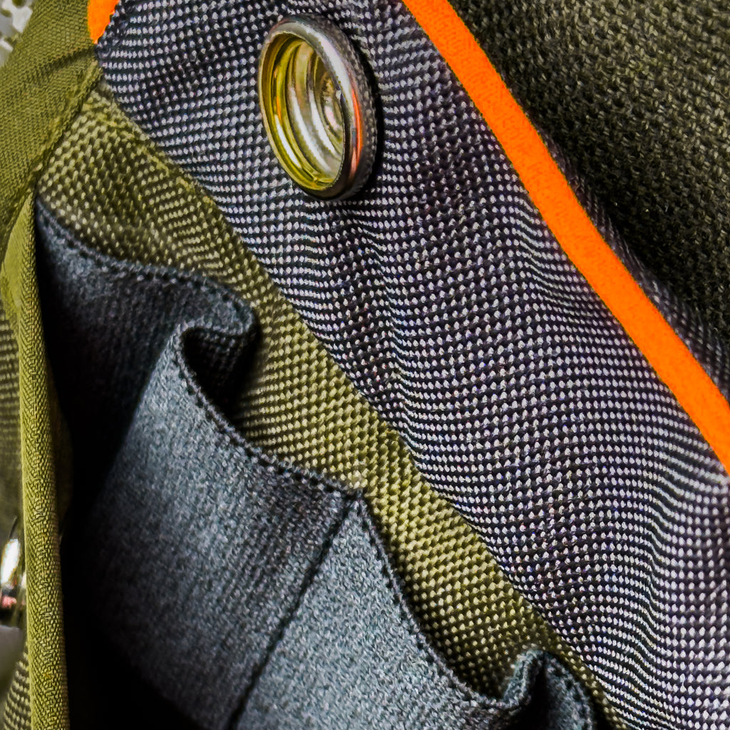Alta visibilità integrata: inserti arancioni per maggiore sicurezza in zone boschive.